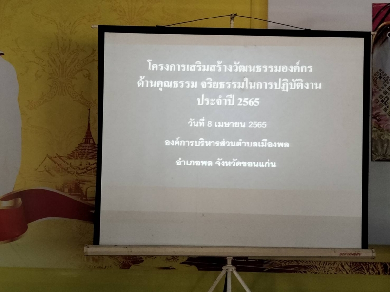 วันที่ 8 เมษายน 2565 องค์การบริหารส่วนตำบลเมืองพล จัดทำโครงการสร้างเสริมวัฒนธรรมองค์การ ด้านคุณธรรม จริยธรรมในการปฏิบัติงาน